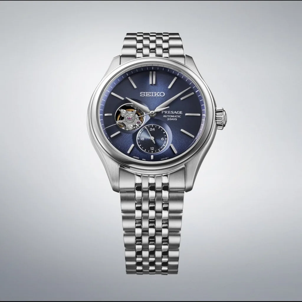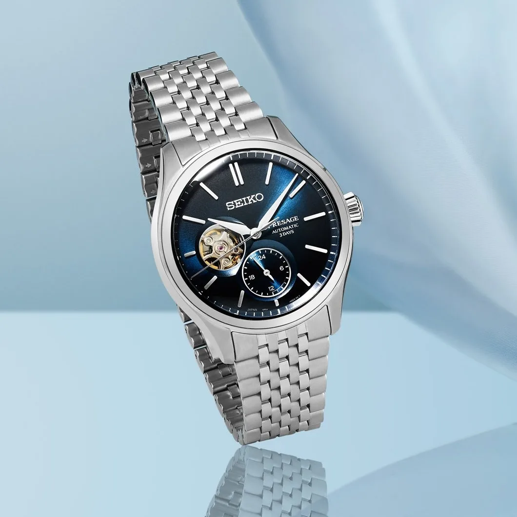 The casework is familiar territory for those who followed last year’s Presage releases. Measuring 40.2mm x 13mm, with a 46mm lug-to-lug, the stainless steel shell carries both brushed and polished facets. It is sealed with a dual curved sapphire crystal, matched by a domed caseback that absorbs some of the thickness. A screw-down display back reveals the mechanics within and the watch is secured against 100 metres of water.