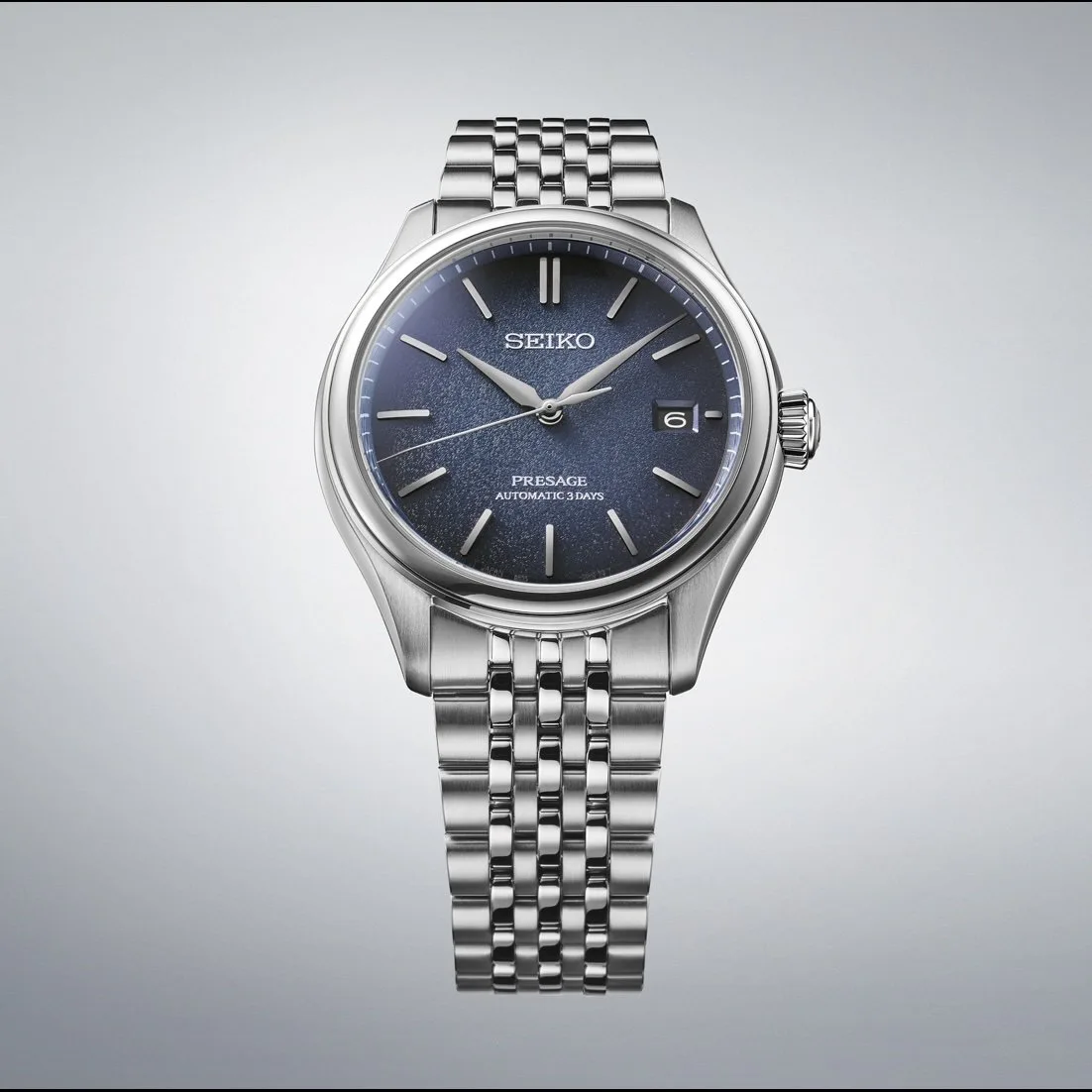 The casework is familiar territory for those who followed last year’s Presage releases. Measuring 40.2mm x 13mm, with a 46mm lug-to-lug, the stainless steel shell carries both brushed and polished facets. It is sealed with a dual curved sapphire crystal, matched by a domed caseback that absorbs some of the thickness. A screw-down display back reveals the mechanics within and the watch is secured against 100 metres of water.