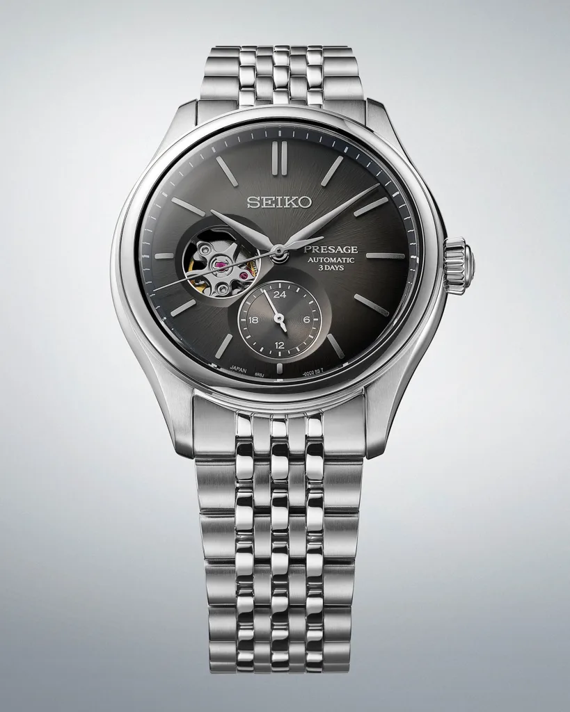 For those who appreciate a glimpse into the inner workings of a watch, the open-heart models of the Presage Classic Series offer a compelling option. These timepieces boast an aperture at 9 o’clock that showcases the intricate mechanics of the automatic movement. Further enhancing functionality, these models incorporate a 24-hour sub-dial at 6 o’clock.