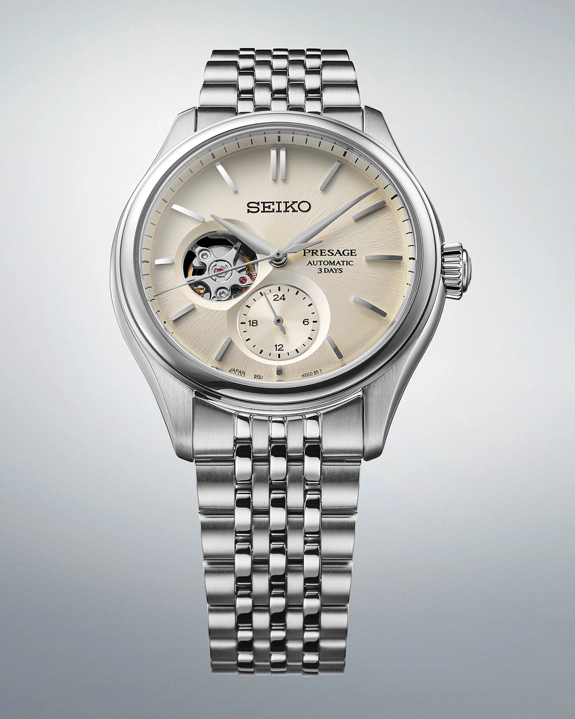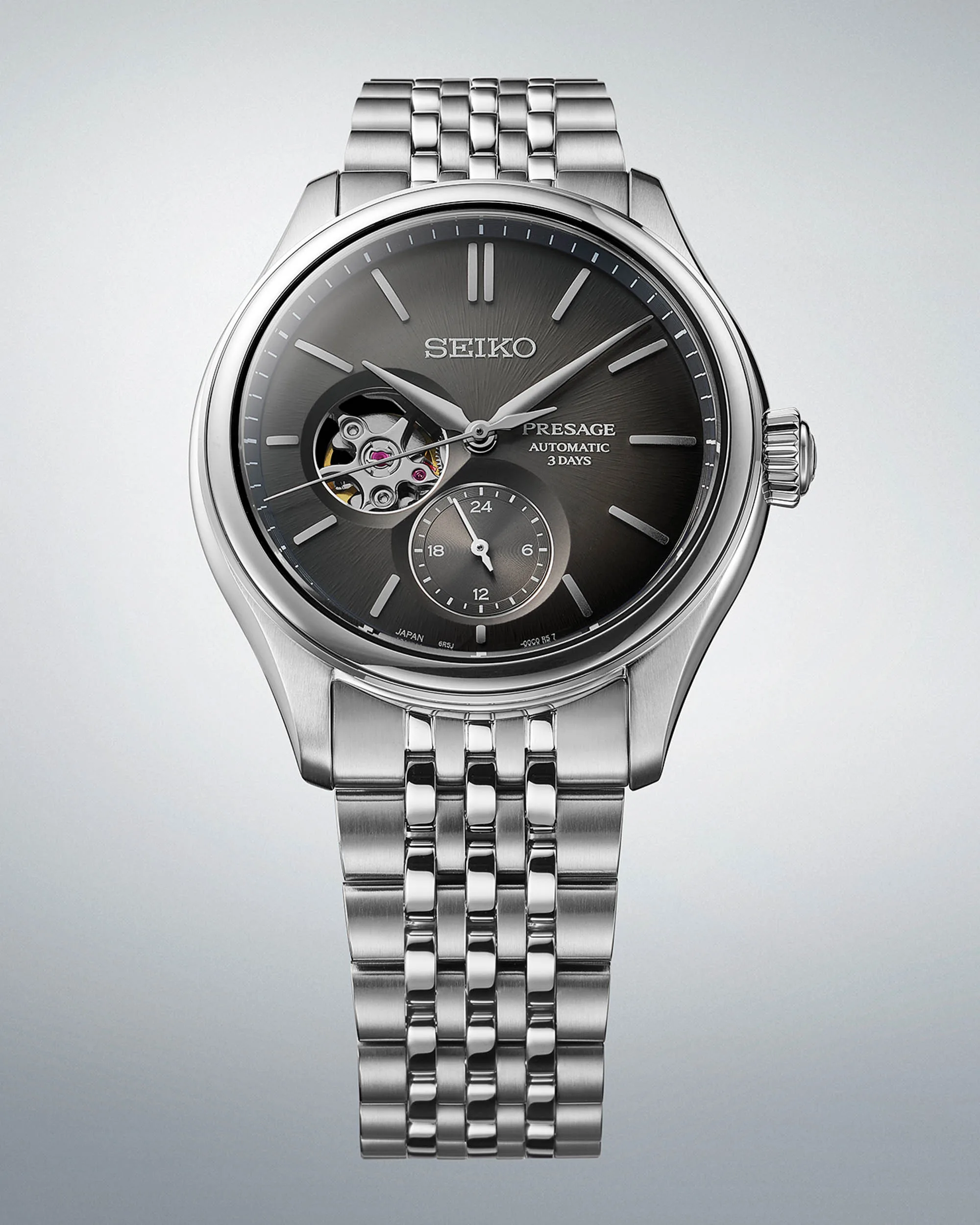 For those who appreciate a glimpse into the inner workings of a watch, the open-heart models of the Presage Classic Series offer a compelling option. These timepieces boast an aperture at 9 o’clock that showcases the intricate mechanics of the automatic movement. Further enhancing functionality, these models incorporate a 24-hour sub-dial at 6 o’clock.