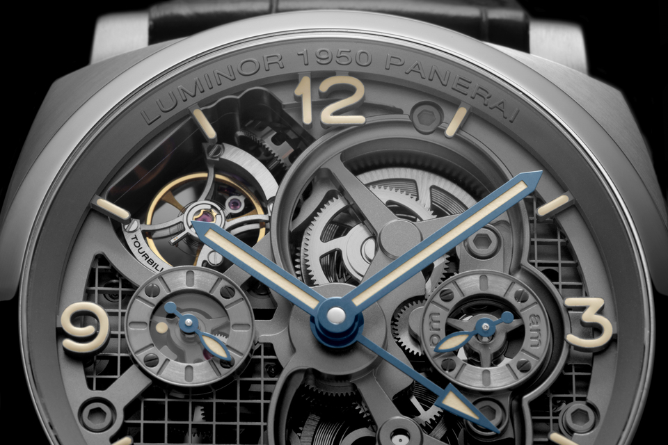 One of the latest output from Officine Penerai, the Lo Scienziato Luminor 1950 Tourbillon GMT Titanio, is art in mechanical form.