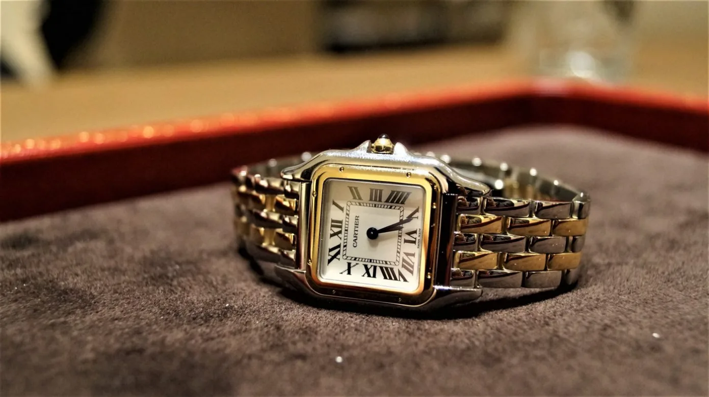 The colors available for the Panthère are yellow gold, rose gold with diamond bezel, rose gold, white gold with diamond bezel, white gold covered in diamonds, white gold covered in diamonds with black enamel animal spots, two-tone steel and yellow gold, plain steel, and a limited edition rose gold with black lacquered links. Price ranges from affordable steel variants to higher end models sporting full gem-set high jewelry elements.