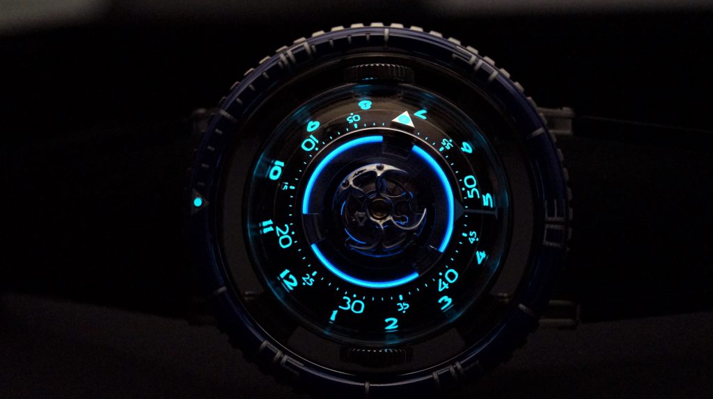 First of all, it is huge. With a diameter of 53.8mm and a height of 21.3mm this watch certainly has some wrist presence. The blue, rotating bezel sits as a ring around the movement and rest of the case. The watch is inspired by a jellyfish so the inner part of the case with the movement is made of sapphire so you can see right into the flying tourbillon and vertically mounted gear train. This vertically mounted gear train is also what makes the watch so tall. It transfers the energy from the winding rotor at the bottom of the movement, which is shaped like a jellyfish’s tentacles, up all the way to the flying tourbillon.