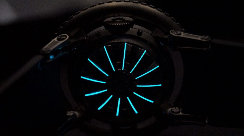 With only 50 meters of water resistance, this isn’t really a watch you would take diving, but you might already have that figured out by the sapphire housed movement. If you turn the light off, you will be able to see the luminescent details on this watch, and they are simply stunning. Remember how I said that they had used inspiration from a jellyfish to make this watch? With the lights off this watch could really be mistaken for a jellyfish. The numerals on the rotating disc as well as the pearl on the bezel are of course luminescent, but in addition to that, the movement has received some attention here. There is a ring of luminescent material around the movement, which reflects off the high polished flying tourbillon as well as other components, which makes it resemble a see-through jellyfish.