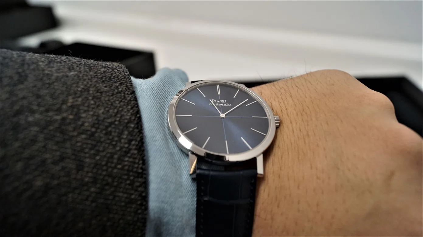 There are two watches in Piaget’s new collection, a 38mm manually wound watch, and a 43mm automatic winding one, there are some subtle differences between them that make then stand out from each other enough. The 38mm watch offers itself as the perfect accomplice to black tie, but it doesn’t really matter whether the suit is from Saville Row or Marks & Spencer (if you live in the UK you’ll probably get this) as the cool blue dial plays down the watch and makes it seem very austere without putting people down. It would be the kind of rich guy who would smile and be cool around those less financially inclined and would be happy to share a drink rather than simply snort and slink back to the corner of haughtiness.