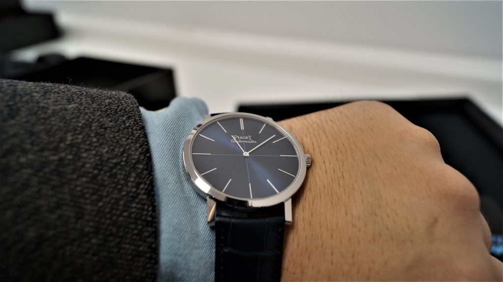 There are two watches in Piaget’s new collection, a 38mm manually wound watch, and a 43mm automatic winding one, there are some subtle differences between them that make then stand out from each other enough. The 38mm watch offers itself as the perfect accomplice to black tie, but it doesn’t really matter whether the suit is from Saville Row or Marks & Spencer (if you live in the UK you’ll probably get this) as the cool blue dial plays down the watch and makes it seem very austere without putting people down. It would be the kind of rich guy who would smile and be cool around those less financially inclined and would be happy to share a drink rather than simply snort and slink back to the corner of haughtiness.