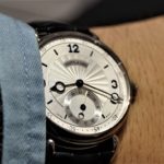 The larger 43mm version offers a couple of differences. As I have mentioned already, this watch is an automatic winding one. The difference is that you can also see this movement through the caseback, the blacked out rotor makes a pleasing addition to the conservative styling of the decorations of the rest of the movement. Remember that rich cool guy is down for fooling around with the less wealthy friends of his, but he still dresses well and arrives on the scene in a drop-head Bentley.