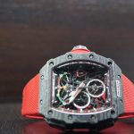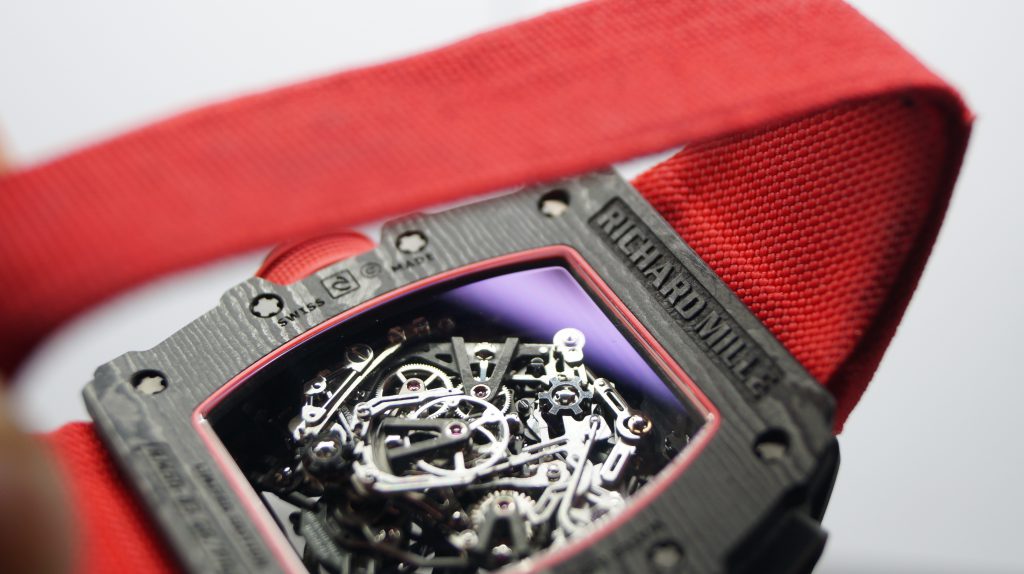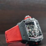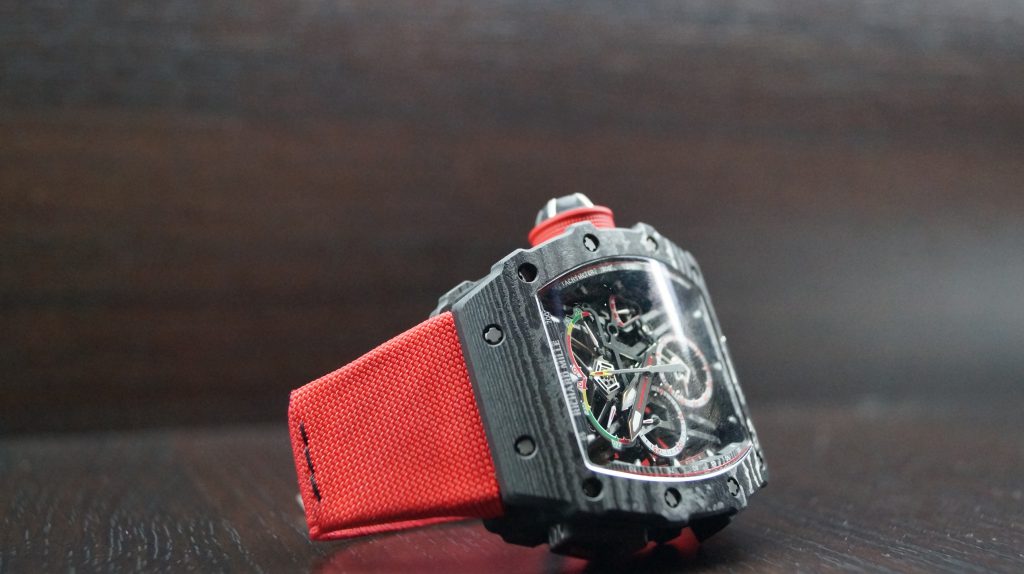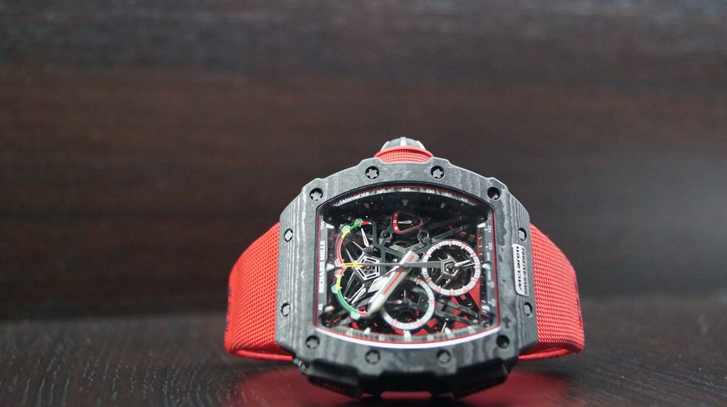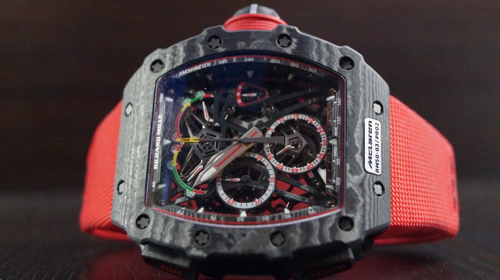 The watch is powered by a lightweight RM50–03 Calibre. Its design is amazing! The skeletonization of critical movement pieces combined with the grade 5 titanium and TPT Carbon for the heavier baseplate and movement bridges resulted to a mere 7 grams weight. It also sports a new split-seconds system that includes a new column wheel operating the different levels of the split-seconds function resulting to less friction making the chronograph very efficient, so good that it packs 70 hours of power reserve.