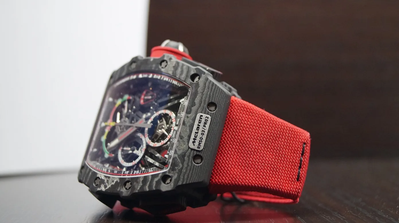As for the classic 44mm x 49mm tonneau-shaped case of the RM 50–03 McLAREN F1 watch, we can see 3 technologies used although 2 of these technologies are already present on most RM watches like the grade 5 titanium and carbon TPT known for its wavy grained texture. The new graphene material added is so revolutionary that it makes the RM 50–03 McLAREN F1 watch even more lighter. Interestingly the caseback also sports 600 parallel layers with graphene reinforcement, now just think about that brute strength my friend. As for the design, well if you’re a petrol head, you’re gonna love this case. Its chronograph pushers look like the air intake ducts of the McLaren-Honda race car. Then there is the huge crown emulating a racing wheel rim, in fact the whole DNA of the watch talks about racing, it’s crazy.