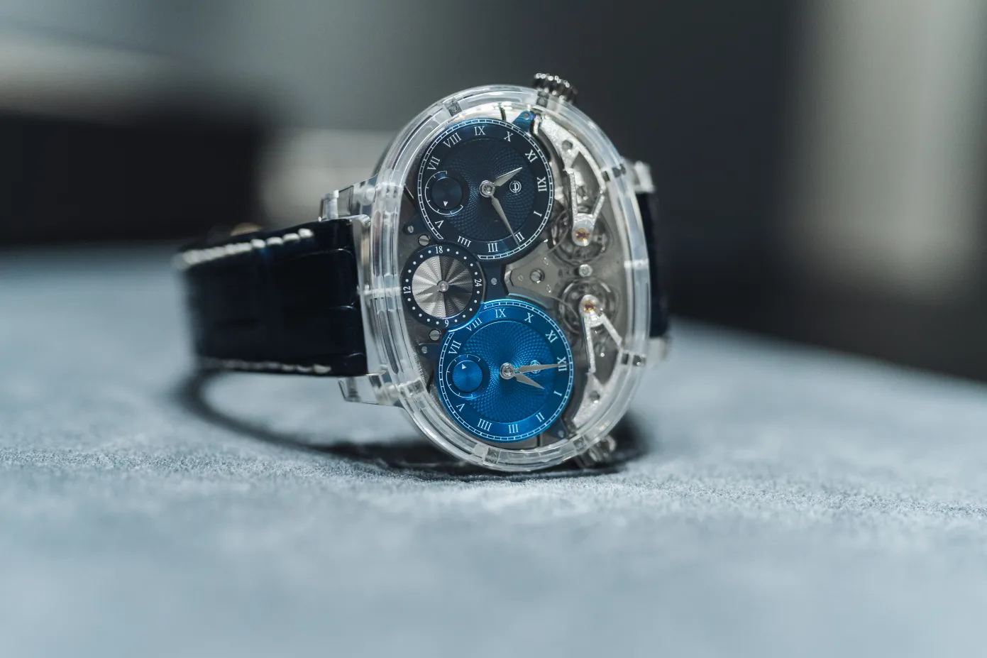 Powering this watch is the brand’s in-house hand wound movement AFR17 which presents two movements built on the same main plate. Each movement has its own independent display, dedicated 24h day/night indication and a dedicated power reserve indicator that keeps track of the massive 110-hour reserve that each movement offers. The displays are quite classically styled and give the watch an elegant appeal with a rich guilloche pattern in the center surrounded by crisp Roman numerals. Interestingly different hues of blue have been chosen for the two dials in order to make it easier to read the time when two separate time zones are being tracked. All this has been cased inside a fully transparent and distinctive looking oval shaped sapphire case, which is meant to give an impressive of the architecture inside.