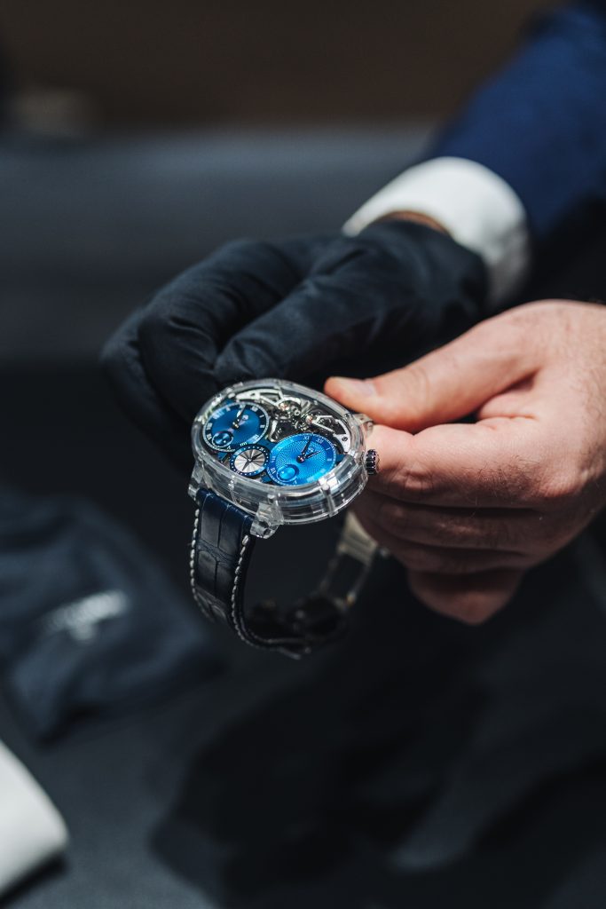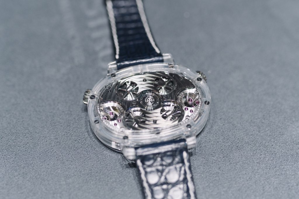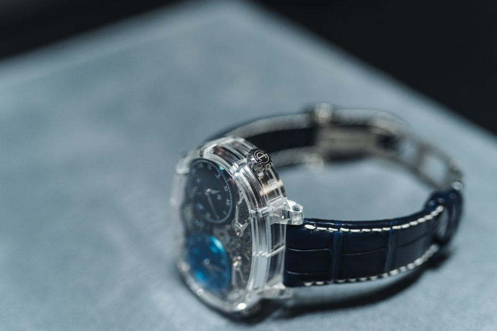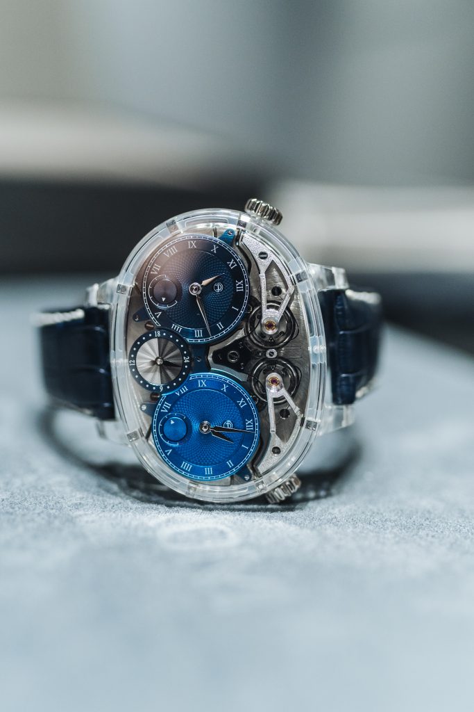 Powering this watch is the brand’s in-house hand wound movement AFR17 which presents two movements built on the same main plate. Each movement has its own independent display, dedicated 24h day/night indication and a dedicated power reserve indicator that keeps track of the massive 110-hour reserve that each movement offers. The displays are quite classically styled and give the watch an elegant appeal with a rich guilloche pattern in the center surrounded by crisp Roman numerals. Interestingly different hues of blue have been chosen for the two dials in order to make it easier to read the time when two separate time zones are being tracked. All this has been cased inside a fully transparent and distinctive looking oval shaped sapphire case, which is meant to give an impressive of the architecture inside.