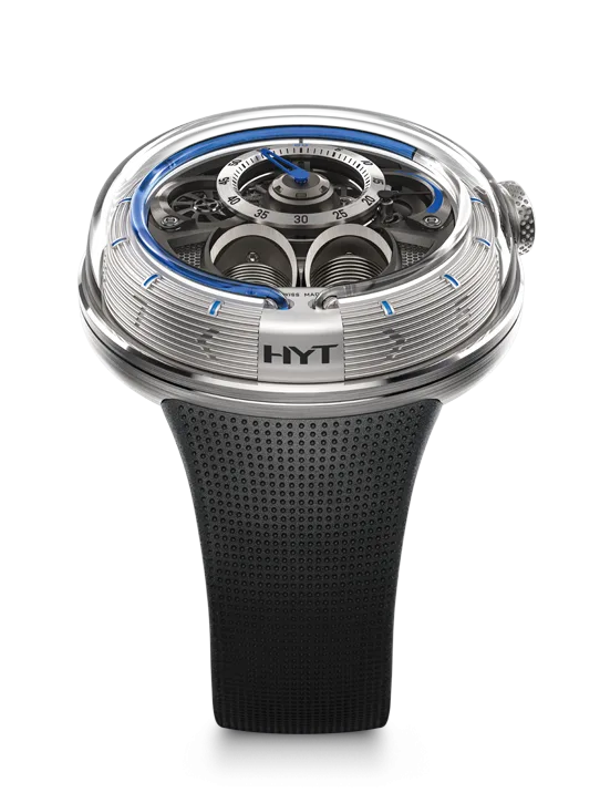 In 2012, HYT debuted its first timepiece collection, the H1, a collection that is currently being phased out. More recently the brand came out with the H0, which was meant to be a new direction using the same “fluidic module” concept which the entire HYT brand is based on. While at a glance it looks like the H0 with its curvy lug-less case and sapphire crystal cap, the H1.0 is a totally new watch that shares nothing with the H0. In mostly sapphire crystal and steel, the H1.0 collection features more visually striking lines and with its lack of lugs, a more comfortable case.