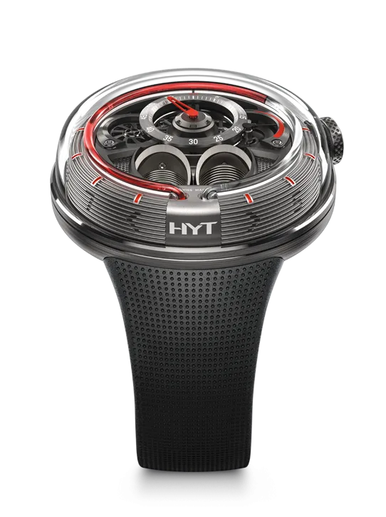 The movement powering the HYT H1.0 is the same proprietary hand-wound calibre used in all the models with upright bellows that offers a power reserve of 65 hours. An isostatic connection links this mechanical movement to the multi-layer bellows containing the two immiscible fluids that are pushed in both directions through the borosilicate glass capillary tube with its special interior nano coating. Though the watch has water inside, it isn’t the best at handling the water pressure on the outside as its equipped with only a 50 meters water resistance.