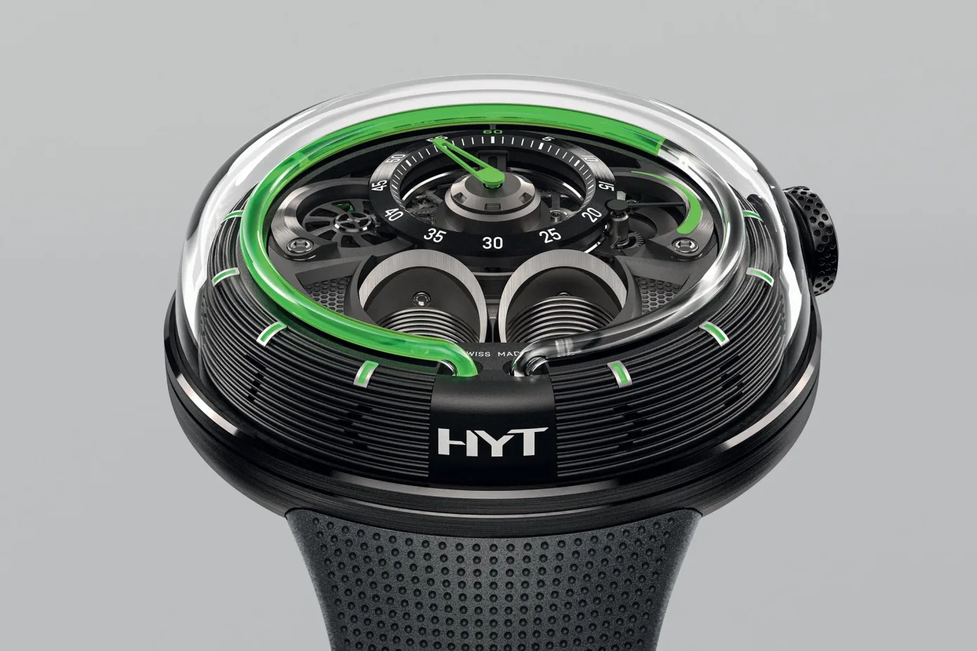 There are three versions of the HYT H1.0 silver, black or anthracite case finishes complement bright blue, green or red immiscible liquids that flow perfectly in time with the elapsed hours. All are secured to the wrist with a subtly patterned black rubber strap and titanium buckle. making an impact feels good. The watch will retail for CHF 49,000. Visit HYT here.