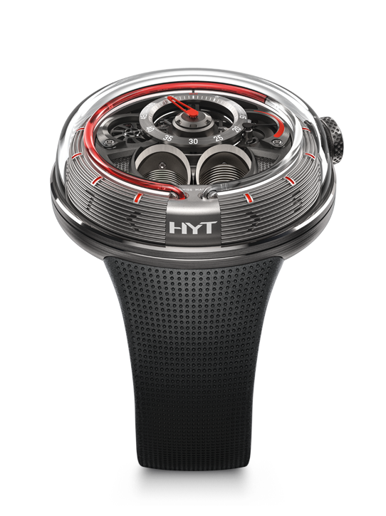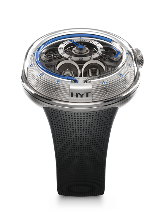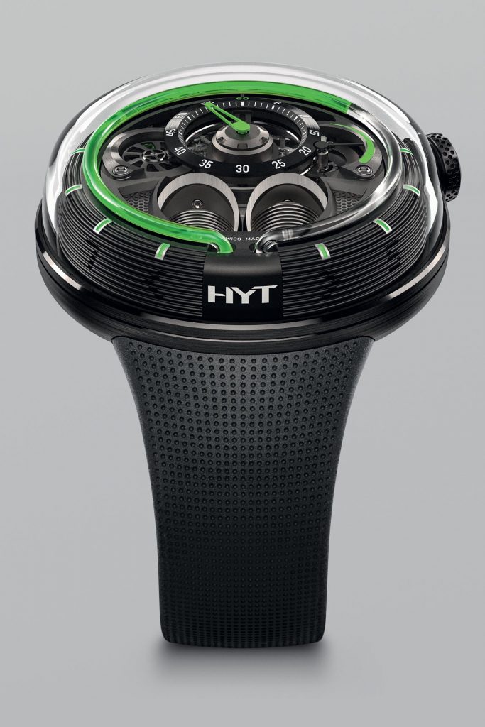 There are three versions of the HYT H1.0 silver, black or anthracite case finishes complement bright blue, green or red immiscible liquids that flow perfectly in time with the elapsed hours. All are secured to the wrist with a subtly patterned black rubber strap and titanium buckle. making an impact feels good. The watch will retail for CHF 49,000. Visit HYT here.