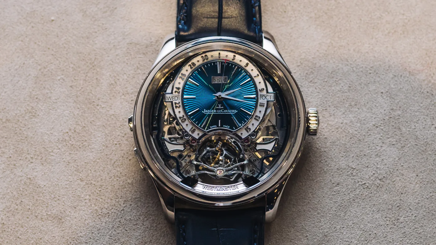 Jaeger-LeCoultre released their first Gyrotourbillon watch in the year 2004 making this the brands 5th effort at the spectacular complication which is now smaller than the previous versions contributing towards making this a quite wearable watch with the white gold case measuring 43mm wide and 14.08mm tall. While the tourbillon negates the effect of gravity aiming for supreme accuracy, it does tend to be a power-hungry mechanism, which in this instance is powered by a consistent one-minute constant-force mechanism that consists of a spring, known classically as a remontoir d’égalité, that is periodically re-armed by the mainspring and acts as a secondary power source to protect the regulating organ of the movement.