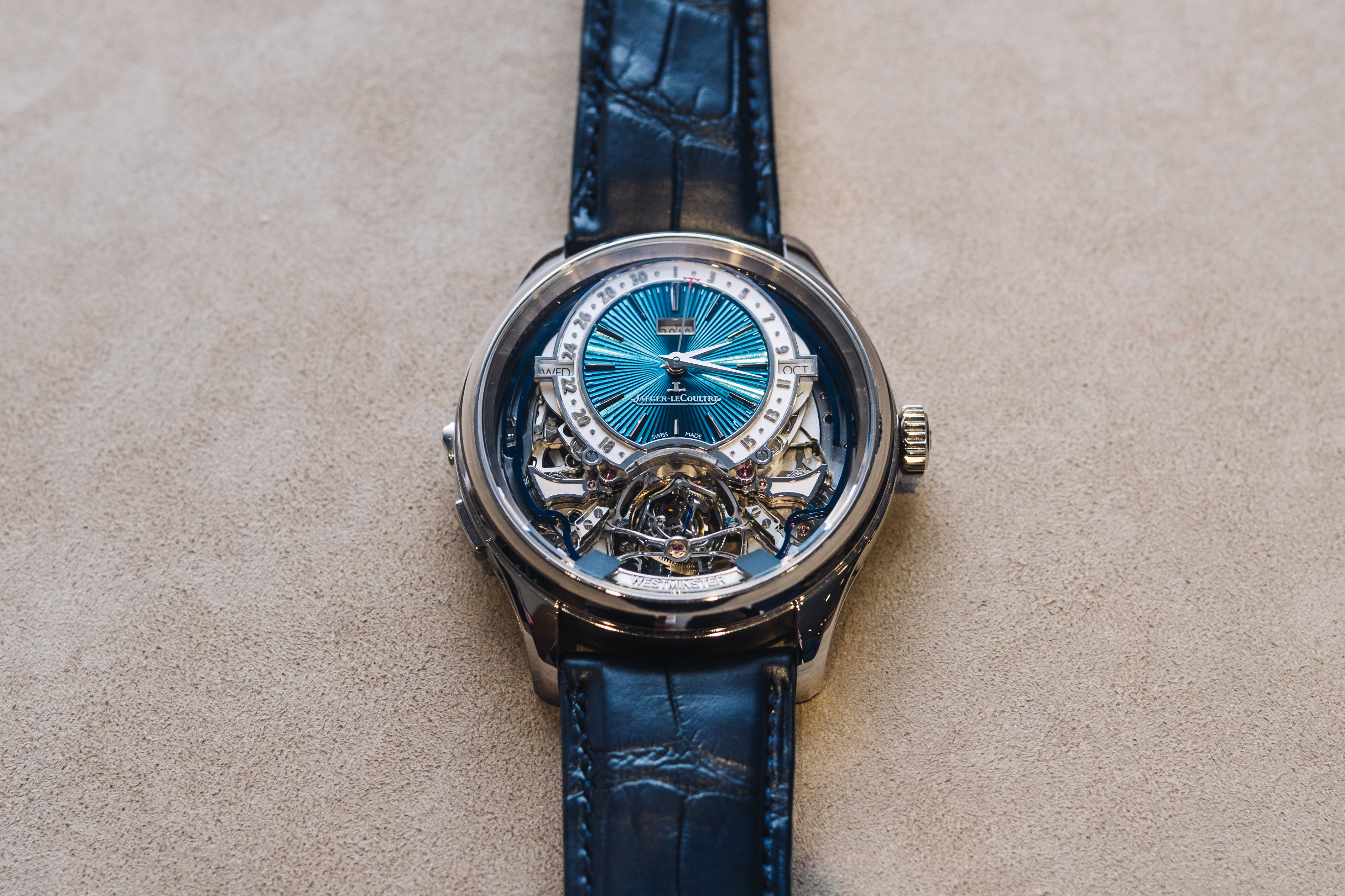 Jaeger-LeCoultre released their first Gyrotourbillon watch in the year 2004 making this the brands 5th effort at the spectacular complication which is now smaller than the previous versions contributing towards making this a quite wearable watch with the white gold case measuring 43mm wide and 14.08mm tall. While the tourbillon negates the effect of gravity aiming for supreme accuracy, it does tend to be a power-hungry mechanism, which in this instance is powered by a consistent one-minute constant-force mechanism that consists of a spring, known classically as a remontoir d’égalité, that is periodically re-armed by the mainspring and acts as a secondary power source to protect the regulating organ of the movement.