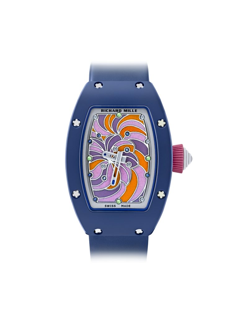One of the most delicious forms of ca-sweets is the soft and chewy marshmallow, effortlessly portrayed on the RM 07-03. The soft swirling colours blend well with the white case of this automatic time only timepiece. If marshmallows aren’t your thing, there’s also the blue cupcake version with blue and oranges in there making it even more tempting. I’d imagine you would have trouble digesting the TZP ceramic case, though. The dimensions of these watches are: 45.32 x 32.30 x 11.93 mm