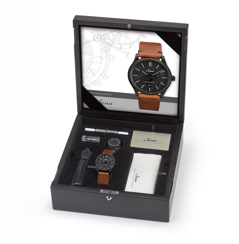 Considering that you would be dropping quite a hefty sum, Sinn does provide exclusive extras for the Model 1800 S Damaszener. You can have it on a nice box complete with various tools such as a strap changing tool and a Sinn loupe if you want to take a deeper look at the groovy appearance of Damascus steel. Of course, Damascus steel definitely looks good on either black or brown leather strap. For more info, please visit sinn.de