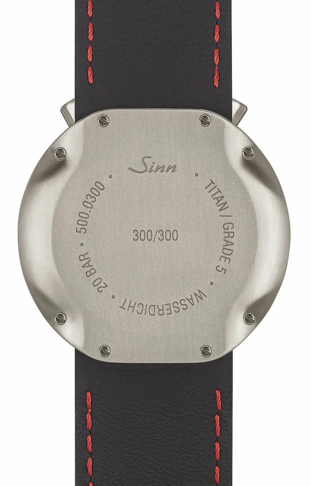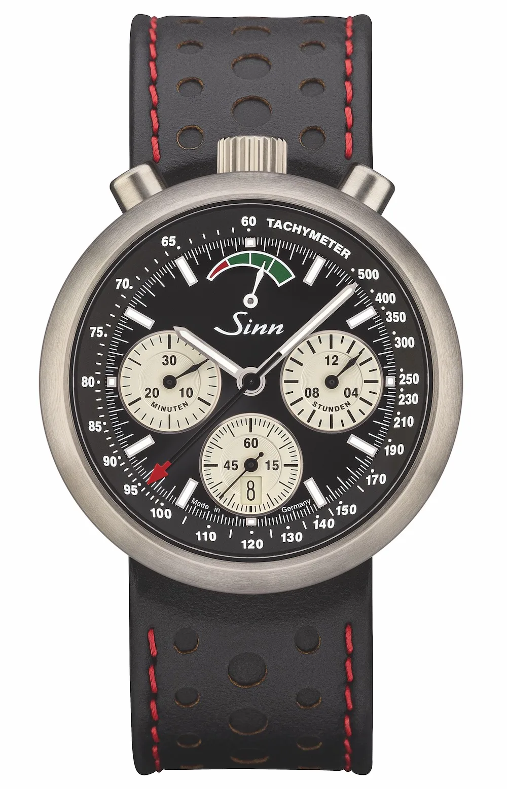 The dial of the watch uses a 3-6-9 subdial layout that we are all familiar with. There’s also a power reserve indicator at 12 o’clock, it’s red and matches the tip of the chronograph seconds hand and the contrasting stitching in the leather racing strap. I like the reverse panda style of this watch with its white subdials, but I wonder how legible it will be in person as Sinn has printed large markers and numbers and the names of the functions on them. I think it might be a recipe for a legibility disaster (did I forget to mention the date at 6 O’clock?).