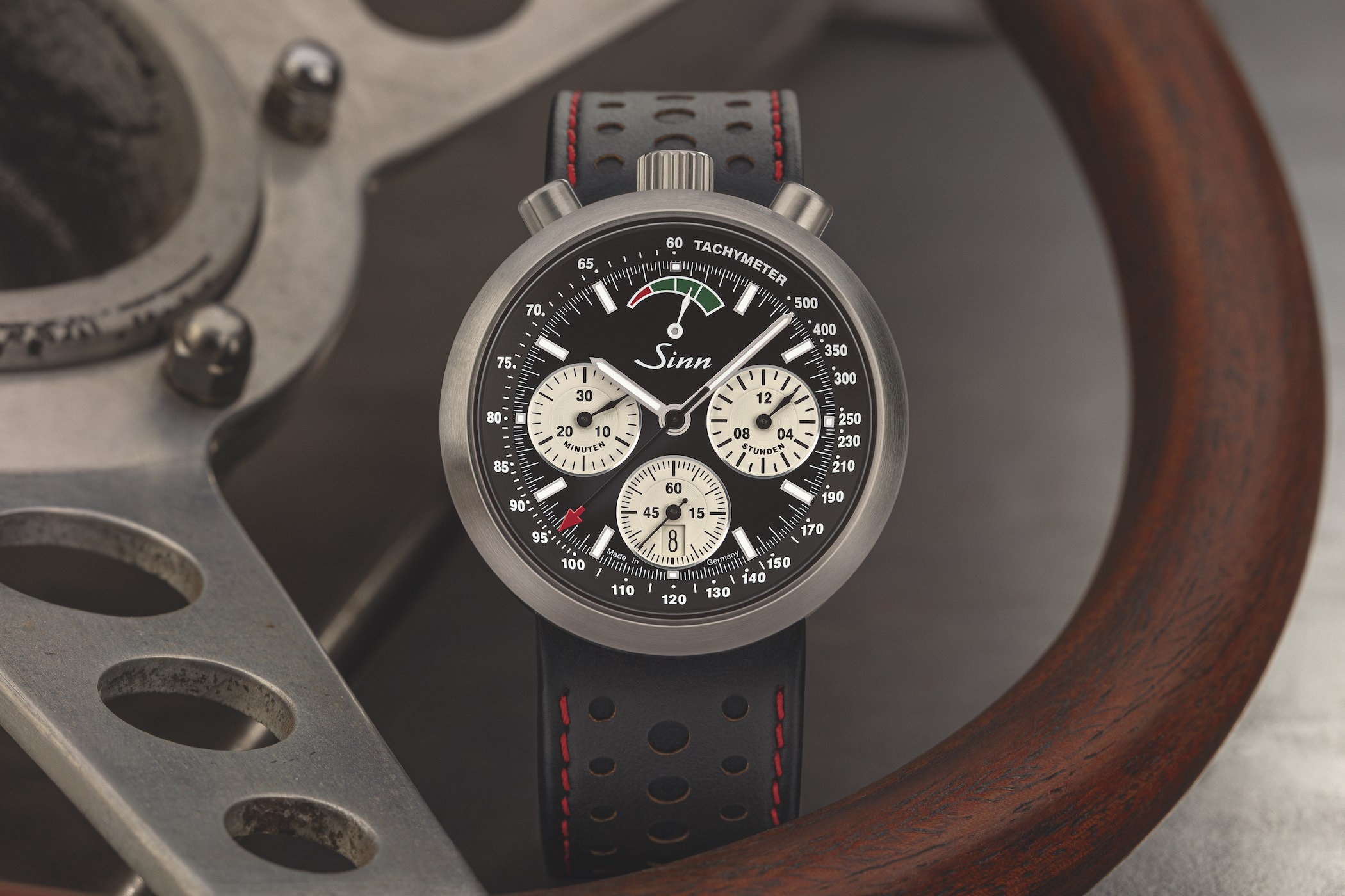 The dial of the watch uses a 3-6-9 subdial layout that we are all familiar with. There’s also a power reserve indicator at 12 o’clock, it’s red and matches the tip of the chronograph seconds hand and the contrasting stitching in the leather racing strap. I like the reverse panda style of this watch with its white subdials, but I wonder how legible it will be in person as Sinn has printed large markers and numbers and the names of the functions on them. I think it might be a recipe for a legibility disaster (did I forget to mention the date at 6 O’clock?).