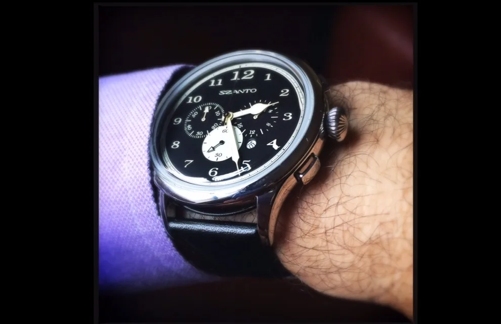 The dial is white-on-black with minute and hour sub dials on the left and right, and a black-on-white small seconds sub dial at 6 o’clock. I’d call it a panda dial, but with the single white sub dial, it is more of a Cyclops panda. The white is not as bright as you might expect on a brand new watch. Instead, contains the slightest tinge of yellow that one might expect with age. It is a subtle but important detail. The Arabic numerals are printed in a delicate serif typeface. Poire squelette hands mark the hours and minutes, arrows handle the sub dials. The large second hand is a simple polished baton. A round date window peeks through between 4 and 5 o’clock. The only text on the dial is the Szanto brand in the upper half. The size of the dial allows ample room for its features, so everything is balanced and none of the numerals are cut off, although the small seconds dial slightly overlaps the other two. A finely delineated black-on-white “railroad track” index frames it all. It is a legible, attractive dial, and it is easy to imagine that it might have once graced your great-grandfather’s pocket watch.