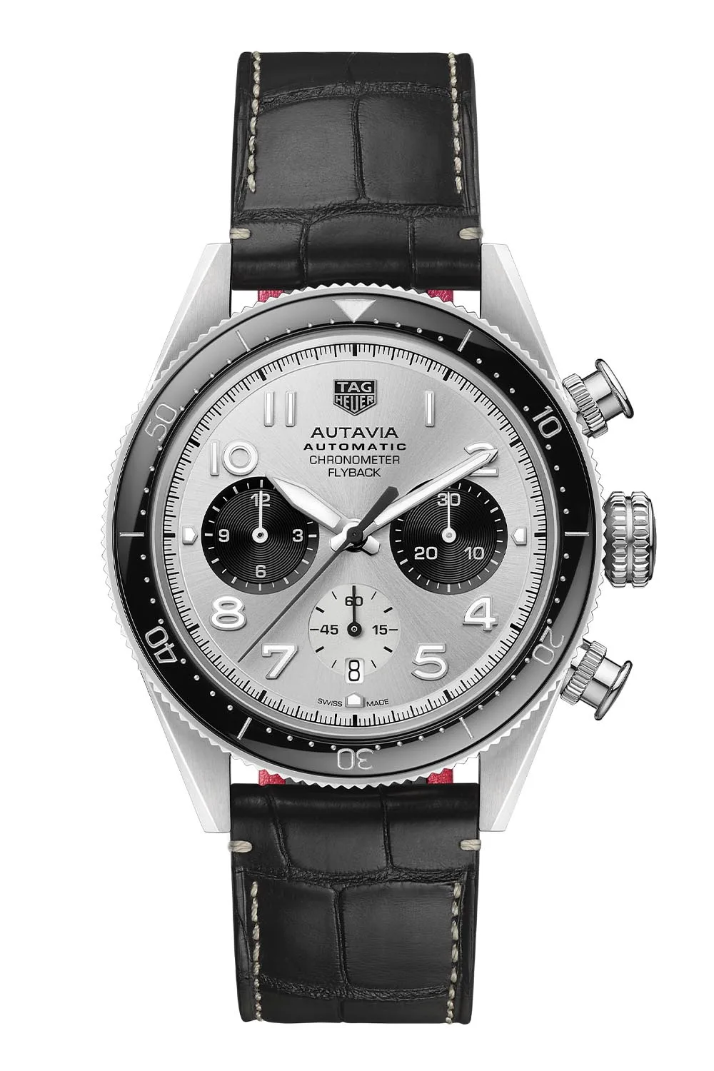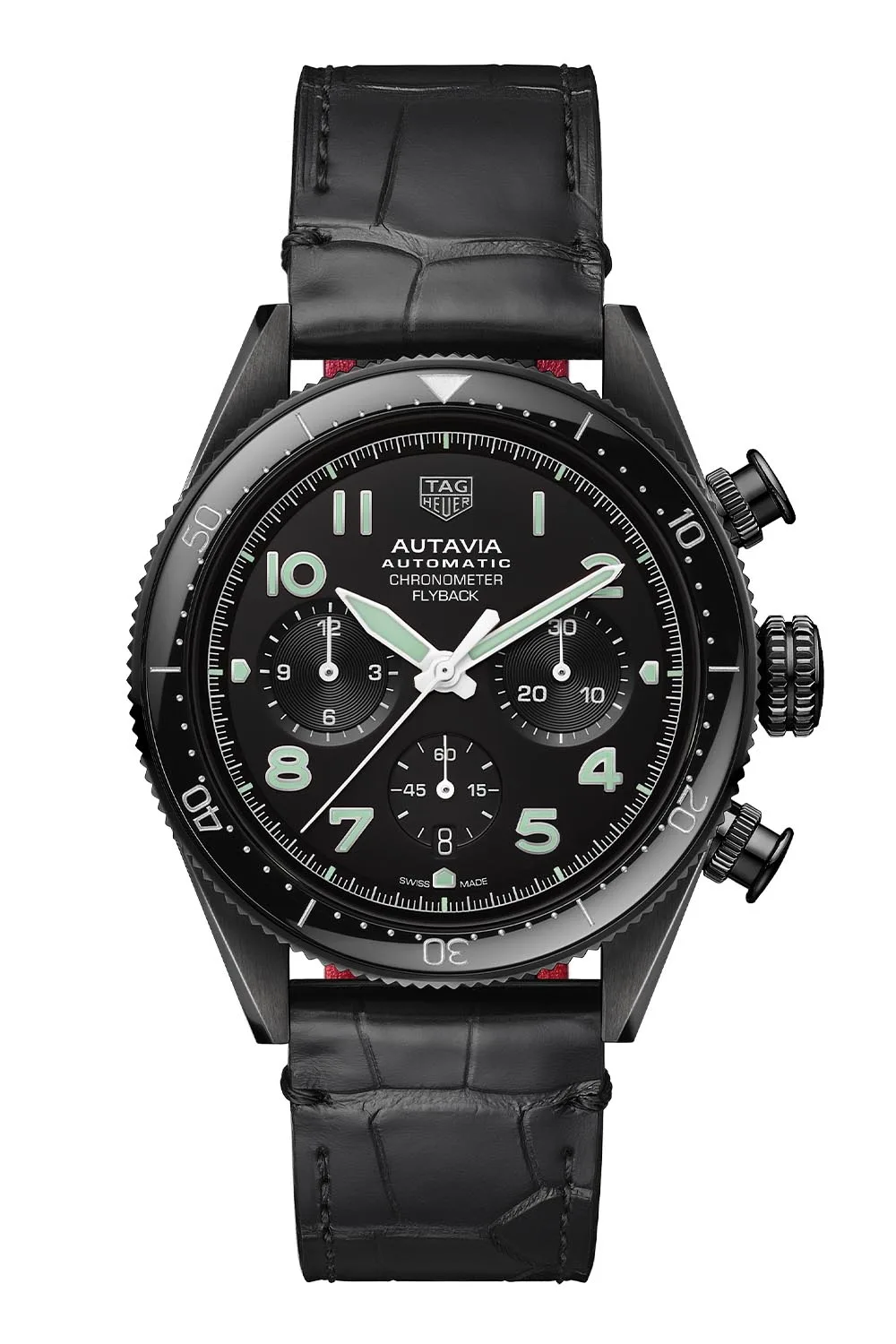 The 316L stainless steel case is both modern and classy with the black PVD treatment, coming in at a contemporary 42mm in diameter with a thickness of 15.68mm. The bidirectional rotating bezel has a black ceramic insert and 60-minute scale, and is legible yet understated. Like the silver model, the case has brushed and polished surfaces, although everything is a bit more muted with the dark coat. The pushers at 2 and 4 o’clock have a knurled base that keeps a consistency with the knurled, screw-down crown. As a flyback chronograph, the timer doesn’t have to be stopped, reset and restarted – a single press of the 4 o’clock pusher resets and restarts the timing functions. A sapphire crystal protects the dial, while a sapphire exhibition case back displays the in-house automatic. Water resistance is rated at 100 meters. A 21mm black alligator strap with a red underside is equipped with a nifty quick-release button and black steel pin buckle.