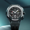 The 316L stainless steel case is both modern and classy with the black PVD treatment, coming in at a contemporary 42mm in diameter with a thickness of 15.68mm. The bidirectional rotating bezel has a black ceramic insert and 60-minute scale, and is legible yet understated. Like the silver model, the case has brushed and polished surfaces, although everything is a bit more muted with the dark coat. The pushers at 2 and 4 o’clock have a knurled base that keeps a consistency with the knurled, screw-down crown. As a flyback chronograph, the timer doesn’t have to be stopped, reset and restarted – a single press of the 4 o’clock pusher resets and restarts the timing functions. A sapphire crystal protects the dial, while a sapphire exhibition case back displays the in-house automatic. Water resistance is rated at 100 meters. A 21mm black alligator strap with a red underside is equipped with a nifty quick-release button and black steel pin buckle.