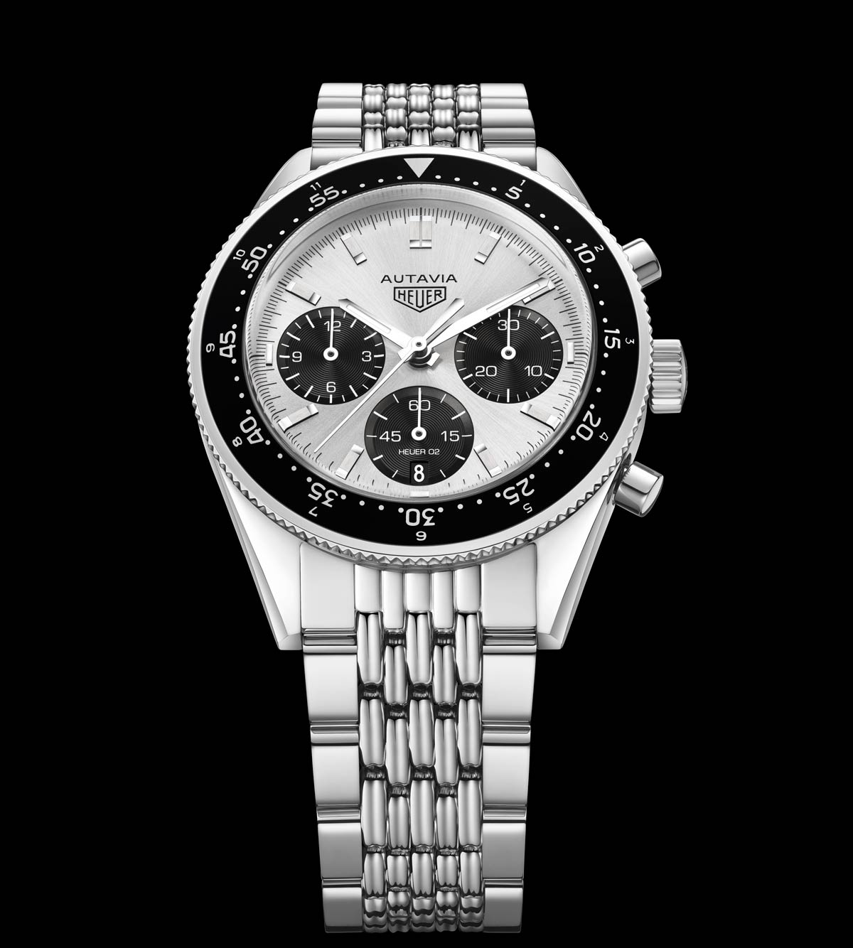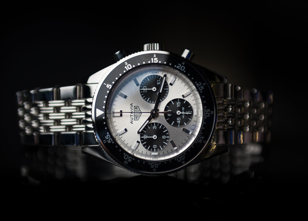 This new edition is pretty cool to look at; it’s got a panda look going on with the black chronograph subdials which contrast the silver dial but go very well alongside the black chronograph bezel. The bezel for this watch is bi-directional, meaning you can move it in both directions, it’s also got a subtle difference to it compared to the standard non-limited edition watch. Can you see it? There are two sets of numbers on it. While the standard Autavia has merely a 12-hour scale and nothing else, this one not only keeps the 12-hour range but it pushes it to the outer edge and squeezes in a 60-minute track as well, making this watch not only more attractive but functional too.