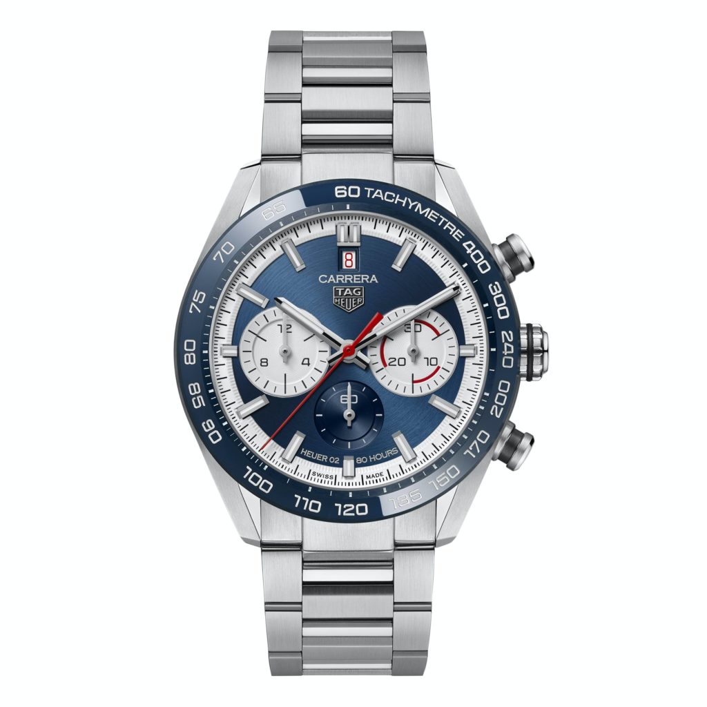 The new Carrera Sport Chronograph 160 Years Special Edition watch (not saying that mouthful again) uses the same modern-looking case with bracelet and bezel that other Carrera models use. That means you’re looking at a diameter of 44mm with short lugs that taper downwards and a solid steel H-link bracelet. There’s also a ceramic bezel on this one, if you go for the white circular brushed dial then that bezel is black, but it is blue on the blue circular brushed dial watch. The case is also 100m water resistant, but I wouldn’t expect the chronograph to be operable whilst submerged.