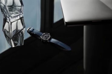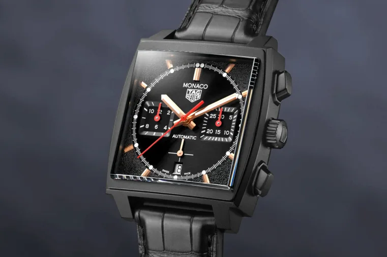 A modern interpretation of the 1974 Heuer Monaco Dark Lord sports a black DLC titanium case.