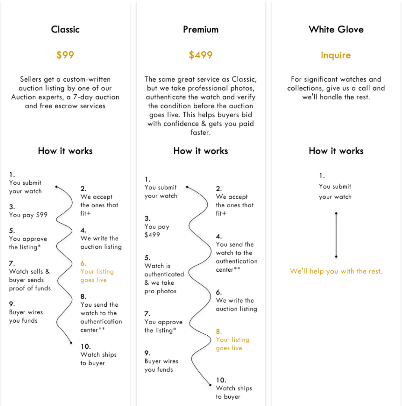 Another key advantage of Grailzee is its competitive commission rate. Depending on the level of service (as demonstrated in the table below), the listing fee ranges from $99 to $499 for sellers and is only a flat 5% for buyers. This eliminates the need for sellers to drive buyers off the platform and provides more money for sellers, while buyers pay less and receive their watches directly from the source.