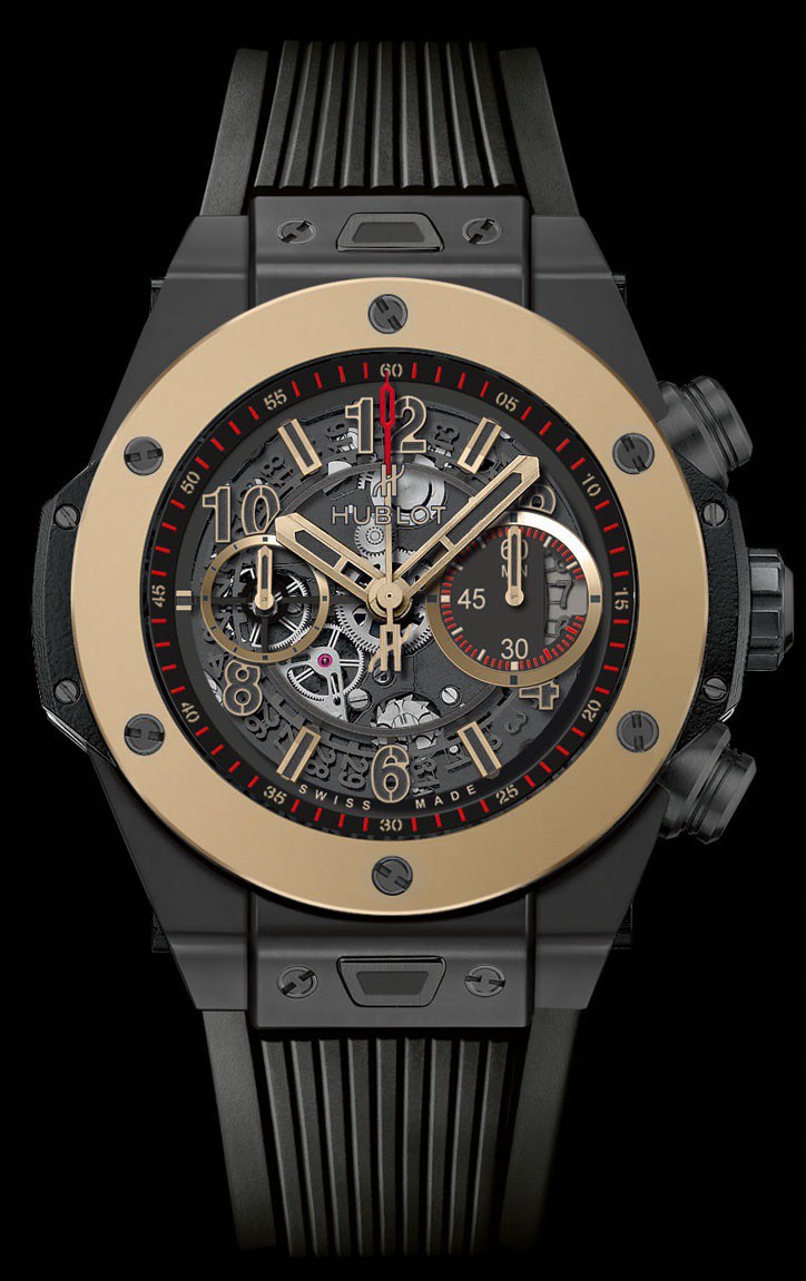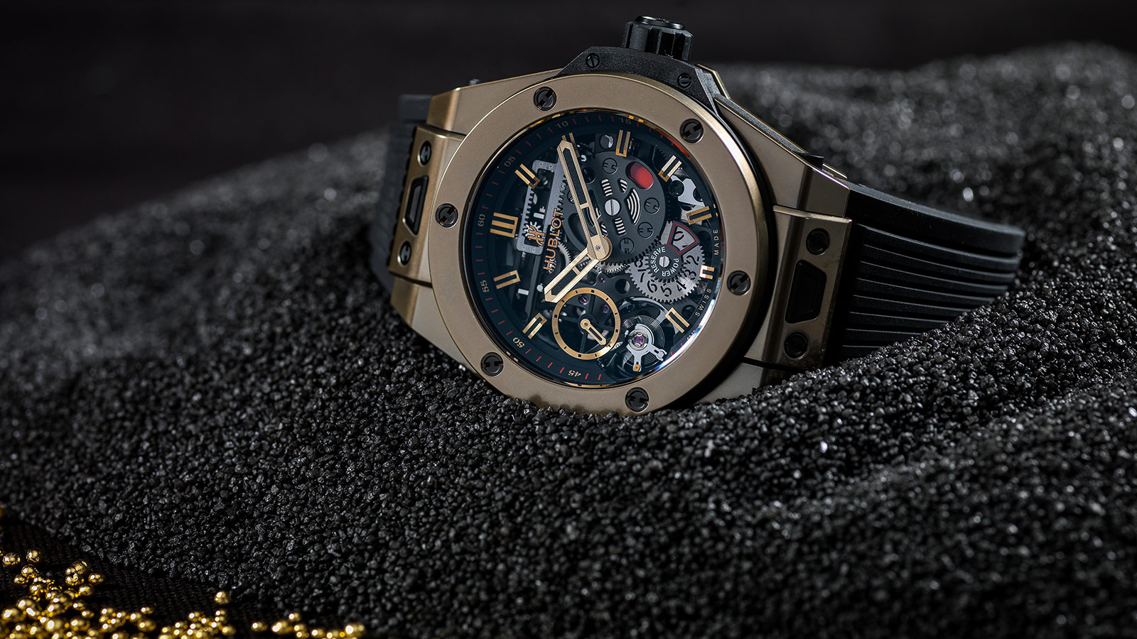 Magic Gold is a never before seen material which aims to fix the inherent problems associated with this precious metal. The chief problem with gold is that it is very malleable, it is easily shaped and polished to perfection, but that means that it is also easily scratched and damaged too. When you see a gold watch, you’re not getting pure gold, as it is too soft, the average purity is 18 karats which means that 75% of the metal is gold and the rest is made of various other metals such as zinc or copper or so forth. To prevent scratching and wear over time, Hublot experimented with different elements of the periodic table. Magic Gold is a mixture of Au (gold) and B4C (Boron carbide), this is a high tech ceramic-based material which is typically seen in tank armour and bulletproof vests. Boron carbide is one of the hardest known materials, alongside boron nitride and diamond. The exact ratio of this alloy remains secret, but what it ensures is the longevity of Hublot watches and resistance to scratches like no other gold watch.