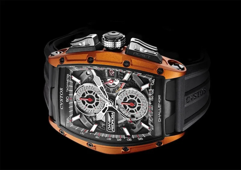 The Challenge is a big watch. The dimensions of the Tonneau-shaped case is 53.7mm long and 41.0mm wide. It is available in a choice of grade 5 titanium or orange aluminium. Below is the orange aluminium example.