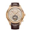 The handsome 44 mm chronograph has two totalizers on a black or silver dial and a date indicator at twelve o’clock.