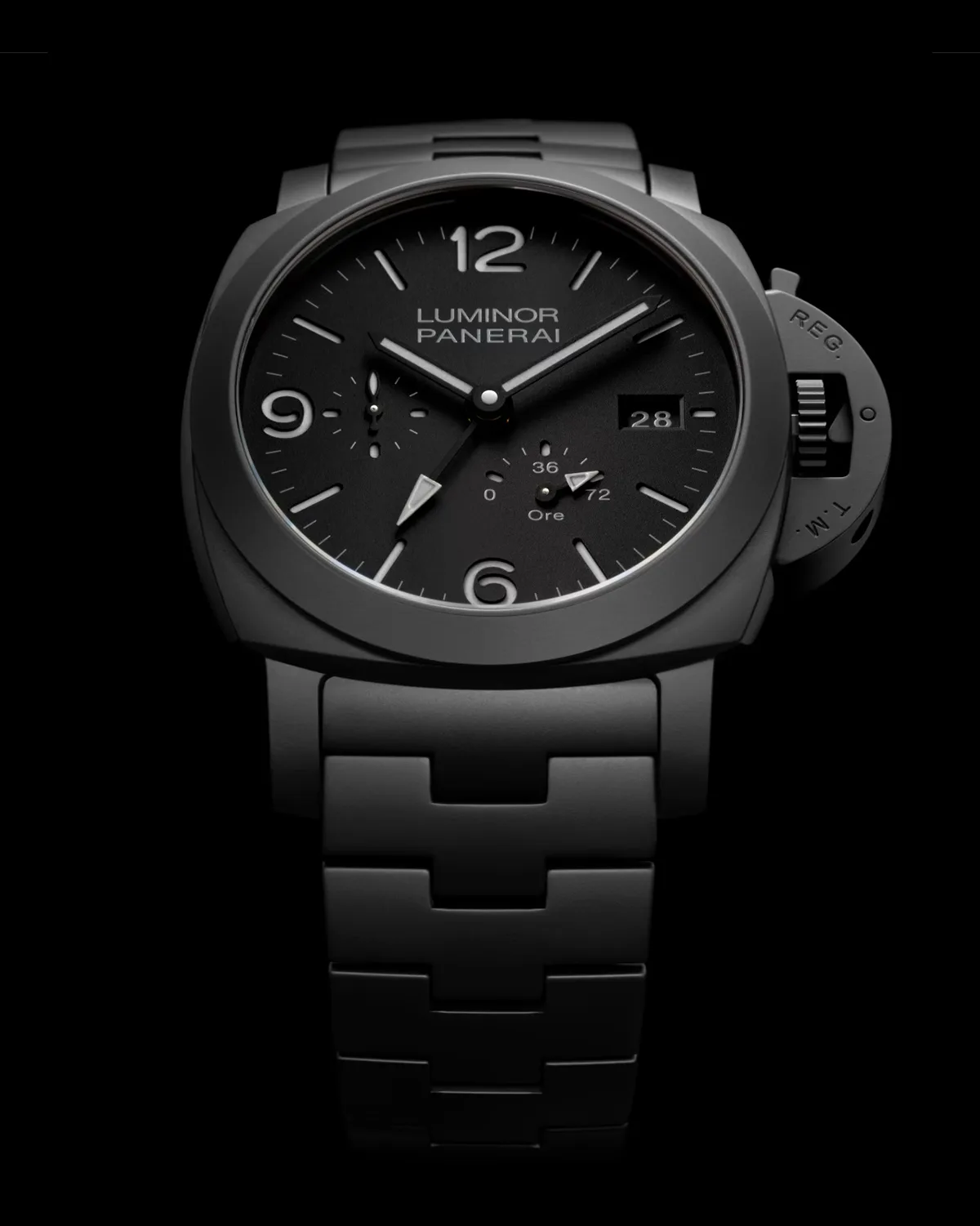 In line with the case, the single link bracelet of the Luminor GMT Power Reserve Ceramica is also machined from the same sandblasted black ceramic.