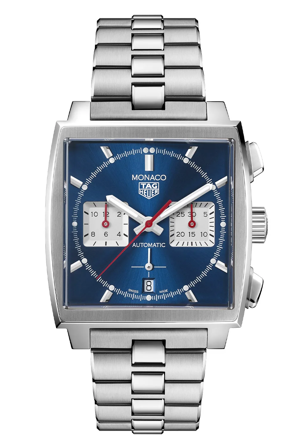 Like the case, the dial on the new Monaco Heuer 02 is classic Monaco for the most part, with a few exceptions. Presented in black or blue, with a sunburst finish, the dial features familiar applied and polished markers, a white printed minute track with circular lume plots at intervals of 5 with double lume pips at 12, twin white sunken sub-registers at 3 and 9, and a date window at 6. One noticeable difference compared to the older Monaco watches is the running second’s hand, which now floats directly on the dial just above the date window without disturbing the balance of the dial. The hands have a baton-style shape style and the hands for the chronograph functions have been painted red to add a splash of color to the dial.