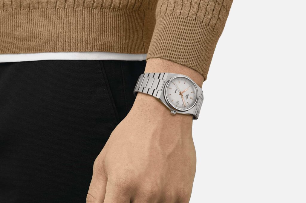 The dial on the PRX, like the case, bears a close resemblance to its vintage reference and looks clean, refined, and highly legible. Offered in blue and black, and silver, the dial features slender applied lume coated indices for hours, a printed minutes track, and a date window at the 3 o’clock position. The silver variation comes with a nice vertical brushing reminiscent of linen dials from the past, whereas the remaining variations come with an elegant sunburst finish. The hands like the indices have a baton-style design, and the hour and minute hands have been coated with luminous paint to improve low light visibility.