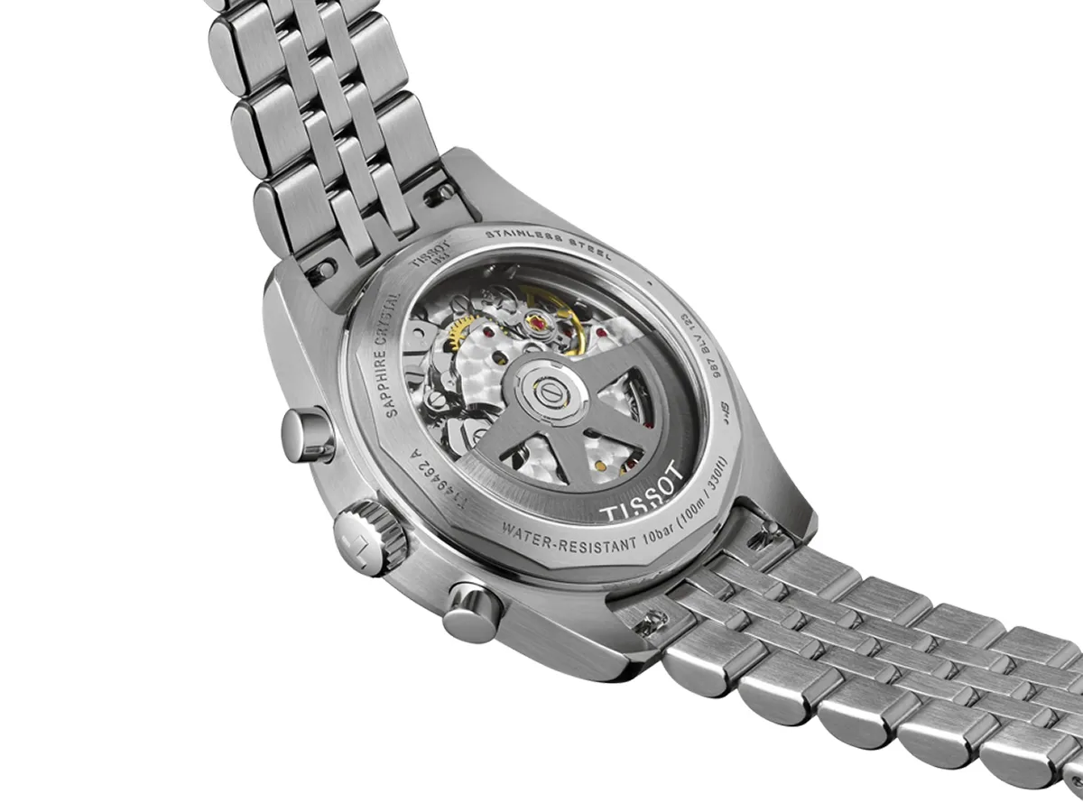Bringing life to the six hands on the dial is the Valjoux A05.231, an automatic chronograph movement based on the Valjoux 7753. Operating at 28,800vph (4Hz), it provides a 68h autonomy and does not include a date function. The Nivachron balance spring enhances resistance to magnetic fields and through the sapphire exhibition case back, the perlage decorated plates and brushed rotor with Tissot branding are visible.