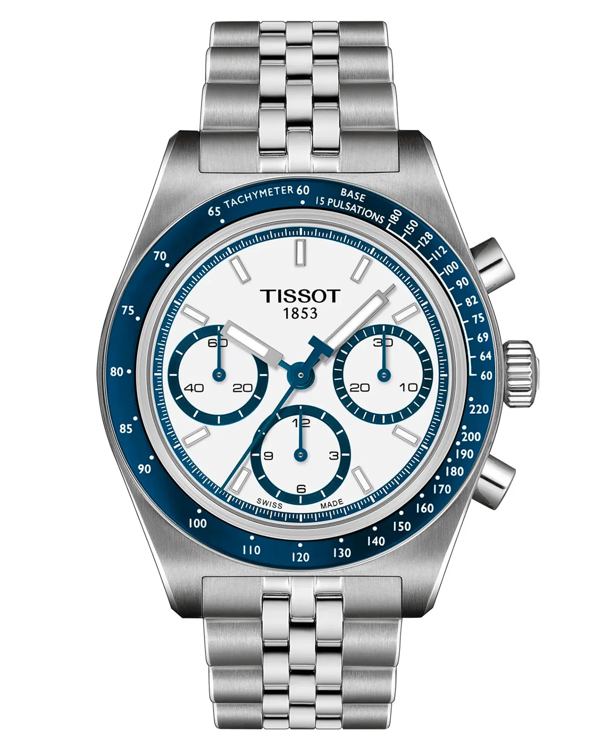 The white dial presents a Tri-Compax layout with blue-rimmed subdials positioned at 3, 6, and 9 o’clock, indicating the 30-minute, 12-hour chronograph counters, and continuous seconds respectively. A blue outer track denotes chronograph seconds, while applied hour markers and baton hands are enhanced with Super-LumiNova. The central chronograph seconds hand includes Tissot’s signature “T” counterweight.