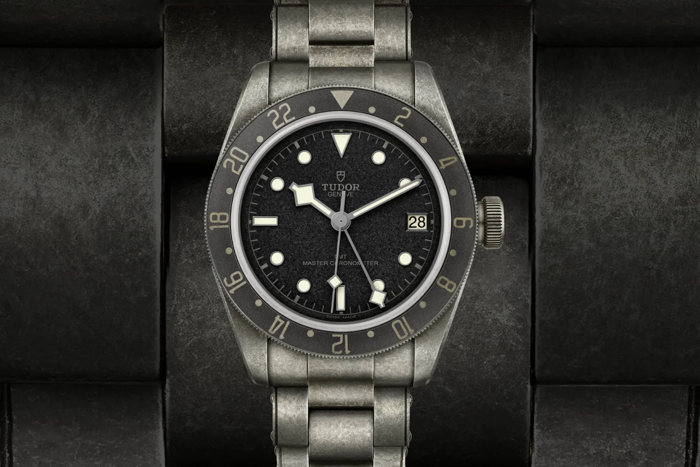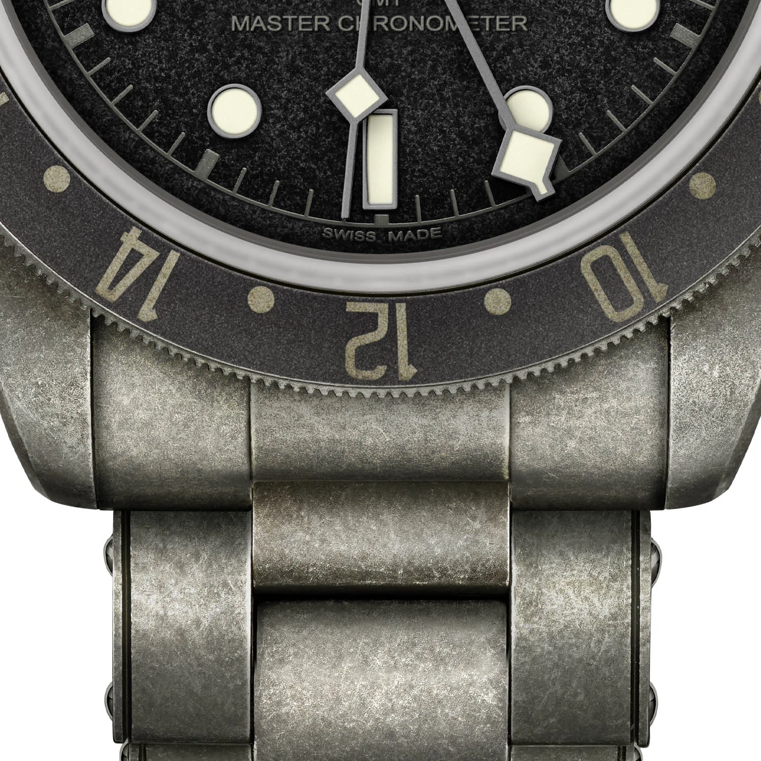 The watch features an artificially-induced aged look. Whether this is to your taste or not, it’s certainly got your attention. The 41mm diameter stainless steel case, bezel and dial have all been given this treatment, but it’s the dial that’s particularly striking with its deep grey-coloured grain. You can also see on the dial are the words ‘Master Chronometer’.