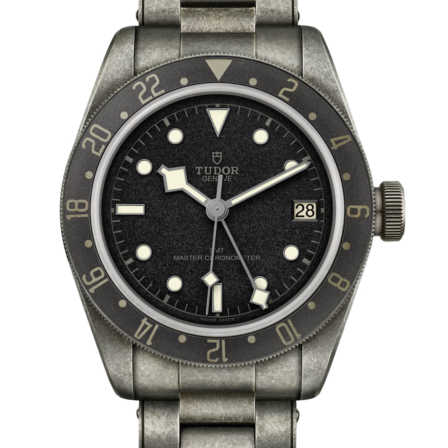 The watch features an artificially-induced aged look. Whether this is to your taste or not, it’s certainly got your attention. The 41mm diameter stainless steel case, bezel and dial have all been given this treatment, but it’s the dial that’s particularly striking with its deep grey-coloured grain. You can also see on the dial are the words ‘Master Chronometer’.