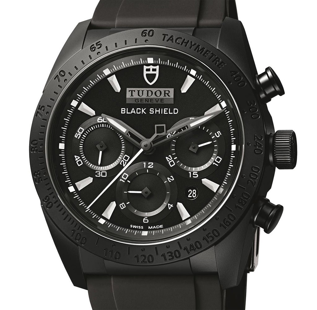 The movement in the Tudor Fastrider Black Shield is the automatic chronograph Caliber TUDOR 7753 which was based on the well-known ETA Valjoux 7753 movement. It has a power reserve of approximately 46 hours and a fast-adjustment date corrector which can be accessed via a button on the right side of the casing at the 9 o’clock position.