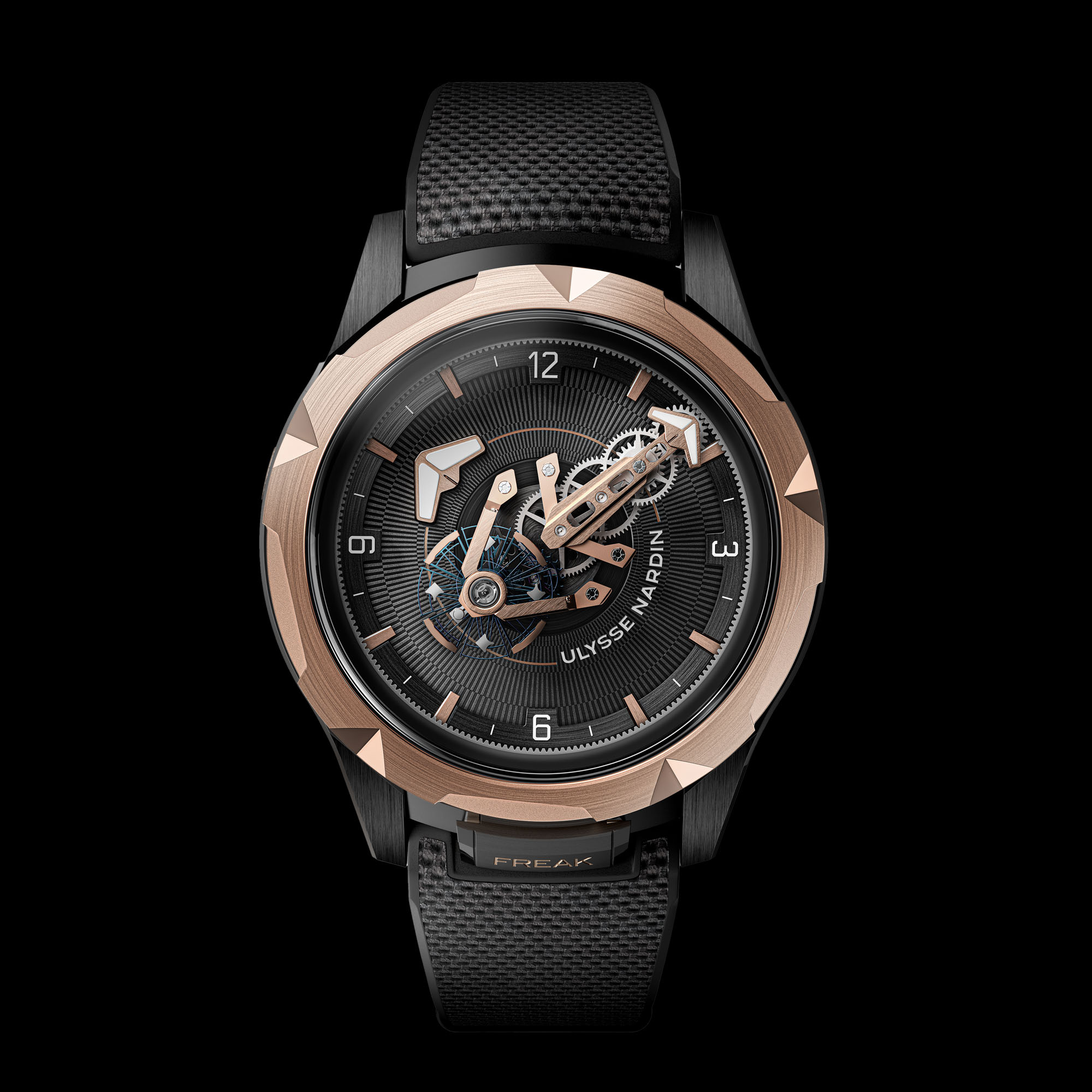The Freak ONE, an original timepiece by Ulysse Nardin that pays homage to the original Freak, has just been released. Freak ONE sits between the Freak X and the Freak S. The gold embellishments and solid gold movement are tributes to the original Freak. As a minute hand, the visible movement revolves around the dial.