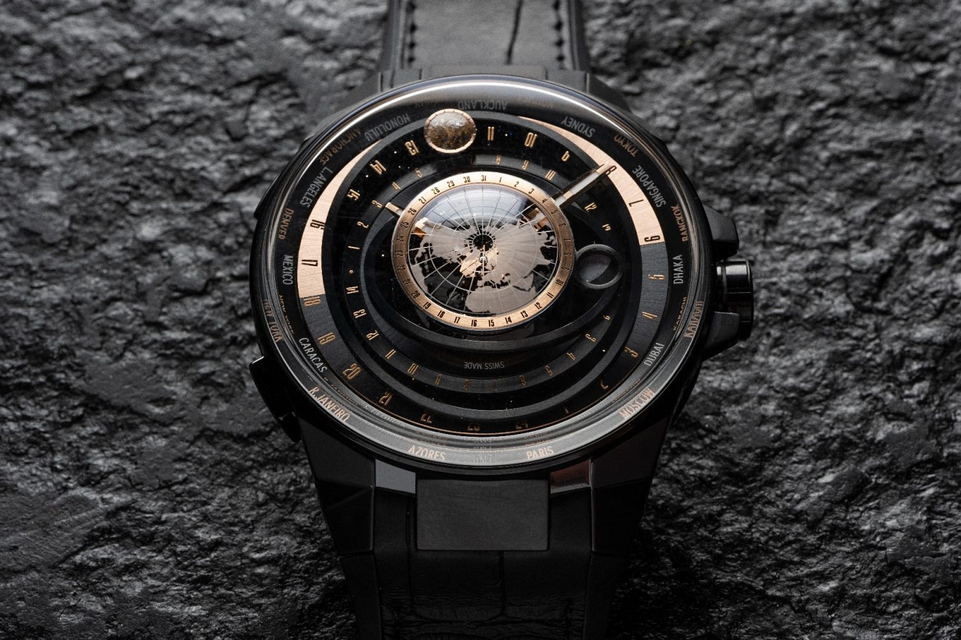 Also adding to that are the elliptical paths which the two disks representing the moon and the sun follow. The moon is, obviously, the closer of the two or we’d all have burned to a crisp by now. This represents the tracks of these objects in the sky, rather than their actual position (you’d need an orrery for that or the Poetic Midnight watch from Van Cleef & Arpels). Oh, and it’s also a world timer, just for good measure.