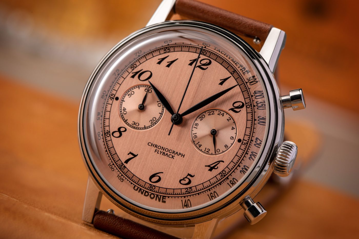 Vintage-inspired designs are all the rage these days and salmon dials are definitely surging. UNDONE capitalized on this with a retro aesthetic that goes beyond just the dial color. The bi-compax chronograph layout features recessed sub-dials at 3 and 9 o’clock with a 24-hour counter and small seconds. It’s a flyback chronograph, allowing the timer to be stopped, reset and restarted with one push.