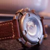 The case measures a 44 mm, which makes it perfect on your wrist. Primarily this is down to the stylish case design and choice of materials in production. The case is mechanized from solid marine bronze with an old handmade finish which exudes vintage feeling. This combination also makes the timepiece a highweight, but is on the same time very comfortable to wear. Aesthetically the design of the Jules Verne is mind blowing. The old handmade finish of the solid Bronze case perfectly compliments the “staples” and the lugs. I love how the design of the oversized “staples” and lugs “melts” with eachother.