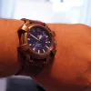 The dial comes in two levels, of navy blue colour and with sunray finish. The choice of the colour and the finish is a perfect match for all the dominant bronze of the case. It’s a very simple and purposeful design with a clean layout and font. Unity Watch has added a domed convex sapphire crystal with antiglare finish to protect the lovely blue dial.