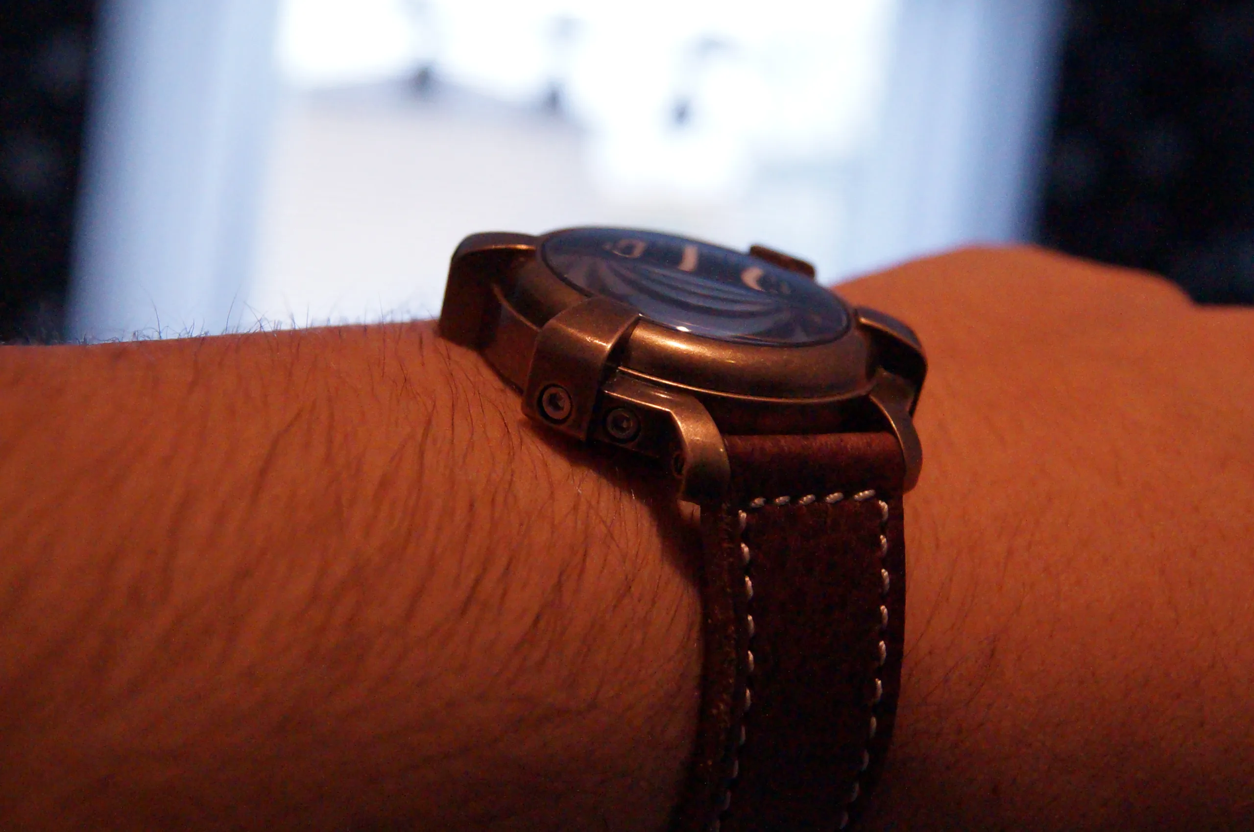 The Unity Watches Jules Verne is the way to go for anyone looking for a reasonably sized bronze watch that is unique, well made, and inexpensive. I absolutely love this watch and feel it is clearly designed to make a bold statement. I would recommend it to anyone who wants a real value-for-money workhorse. Limited to only 30 pieces worldwide. The only thing missing in their collection, is an automatic chronograph and maybe an automatic with a small second. I hope that we could see it happen!