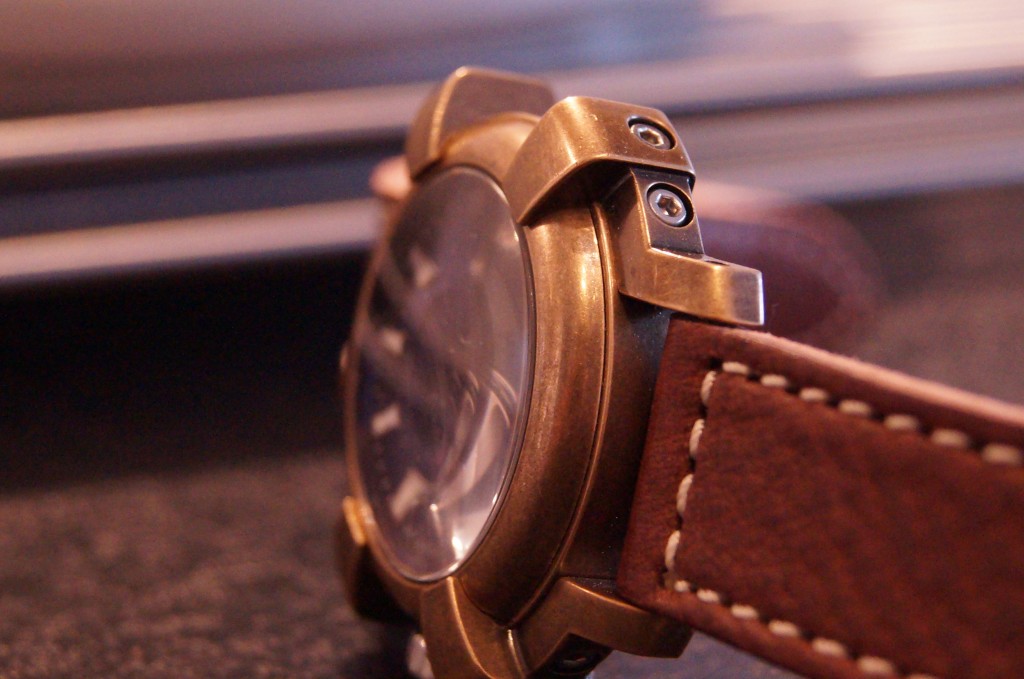 The case measures a 44 mm, which makes it perfect on your wrist. Primarily this is down to the stylish case design and choice of materials in production. The case is mechanized from solid marine bronze with an old handmade finish which exudes vintage feeling. This combination also makes the timepiece a highweight, but is on the same time very comfortable to wear. Aesthetically the design of the Jules Verne is mind blowing. The old handmade finish of the solid Bronze case perfectly compliments the “staples” and the lugs. I love how the design of the oversized “staples” and lugs “melts” with eachother.
